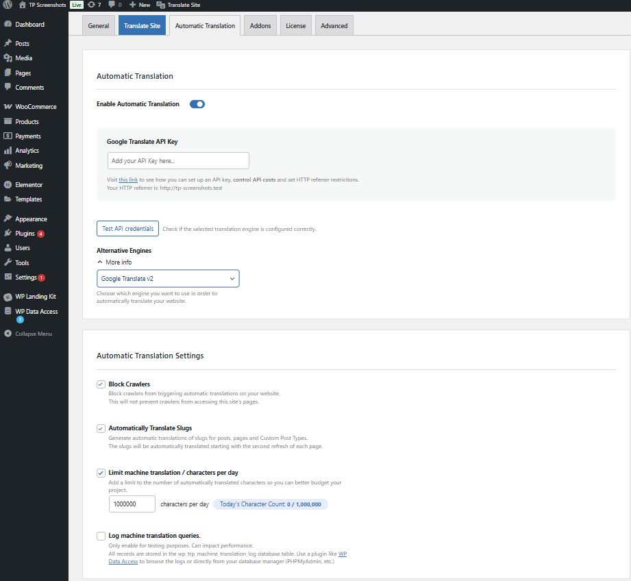 Limit machine translation/characters per day – this option lets you limit the number of characters that the plugin translates through the selected translation API each day.
