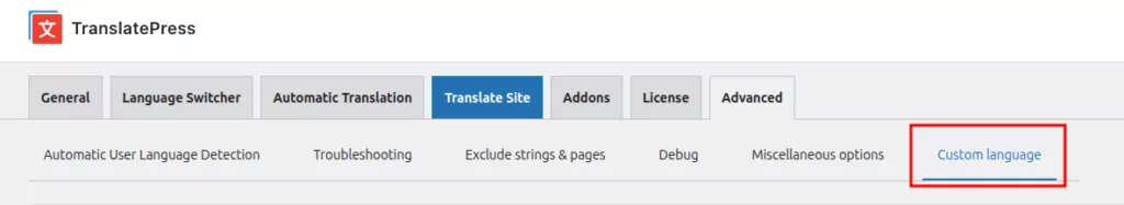 To add a custom language, navigate to TranslatePress → Settings and select the Advanced tab. Then click the Custom language section.