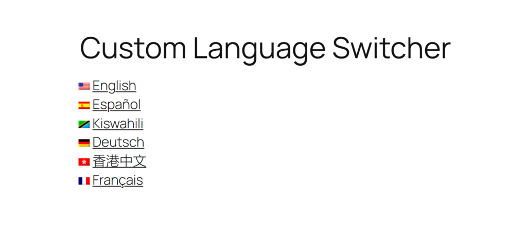 trp_custom_language_switcher().$custom_ls_array[$language_code]['language_name'] – the full language name$custom_ls_array[$language_code]['language_code'] – the language code of the respective language$custom_ls_array[$language_code]['short_language_name'] – the language code of the language, the slug which will be used in the url$custom_ls_array[$language_code]['flag_link'] – a link to the flag of the respective language$custom_ls_array[$language_code]['current_page_url'] – the URL of the current language with the language slug addedHere is an example of a custom-made language switcher: