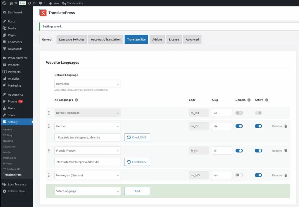 Once your domains are properly configured and accessible, setup the domain mapping in Translatepress.