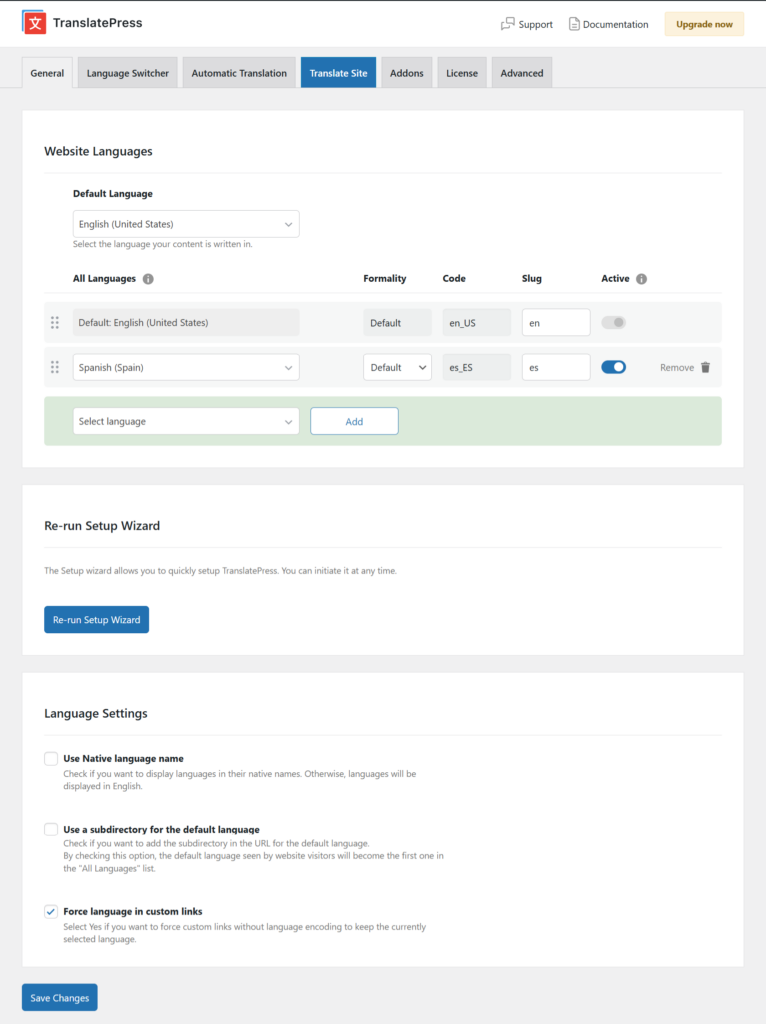 This interface allows you to select the languages you wish to make your website available in. You just have to select the language from the drop-down and click the Add button.