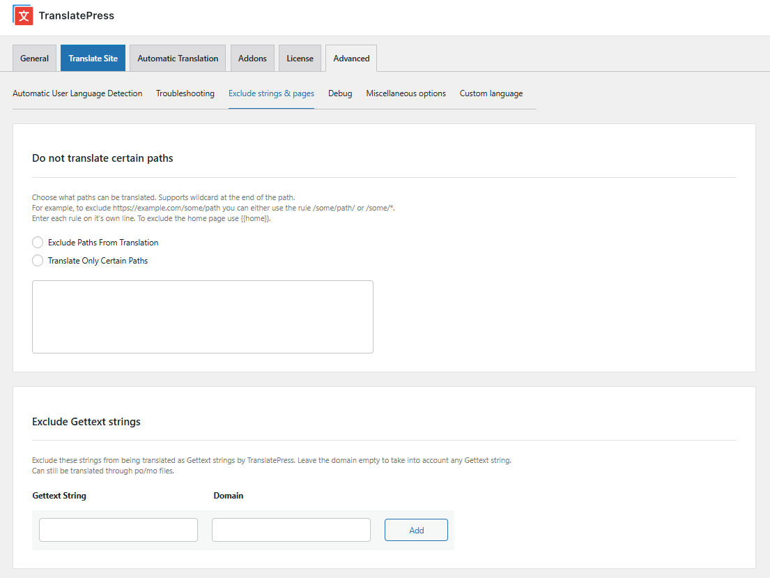 In the previous steps, you have only had to modify some of the TranslatePress settings, but we recommend that you take a look at all the setting pages and see if there’s anything you’d want to modify to suit your needs.