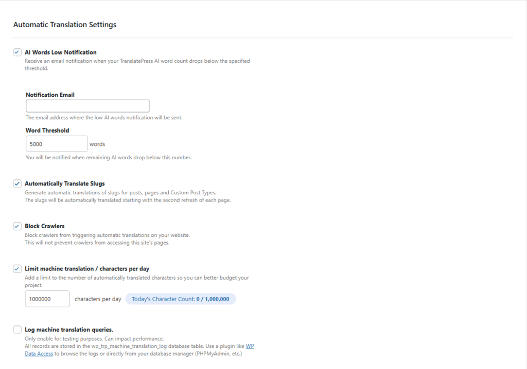 If you decide to use TranslatePress to translate your entire website, then you can try minimizing translation costs by blocking crawlers and setting a daily limit for the automatically translated characters. These can be achieved from the Automatic Translation settings tab.
