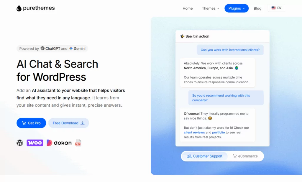 What makes it different from other basic WordPress chat plugins? It uses RAG (Retrieval-Augmented Generation) with semantic search to actually understand what visitors are asking. The plugin indexes your WooCommerce products, WordPress pages and posts, PDFs, and FAQs, then feeds that context to ChatGPT or Gemini before generating answers. Your visitors get accurate, context-aware responses instead of generic AI hallucinations.