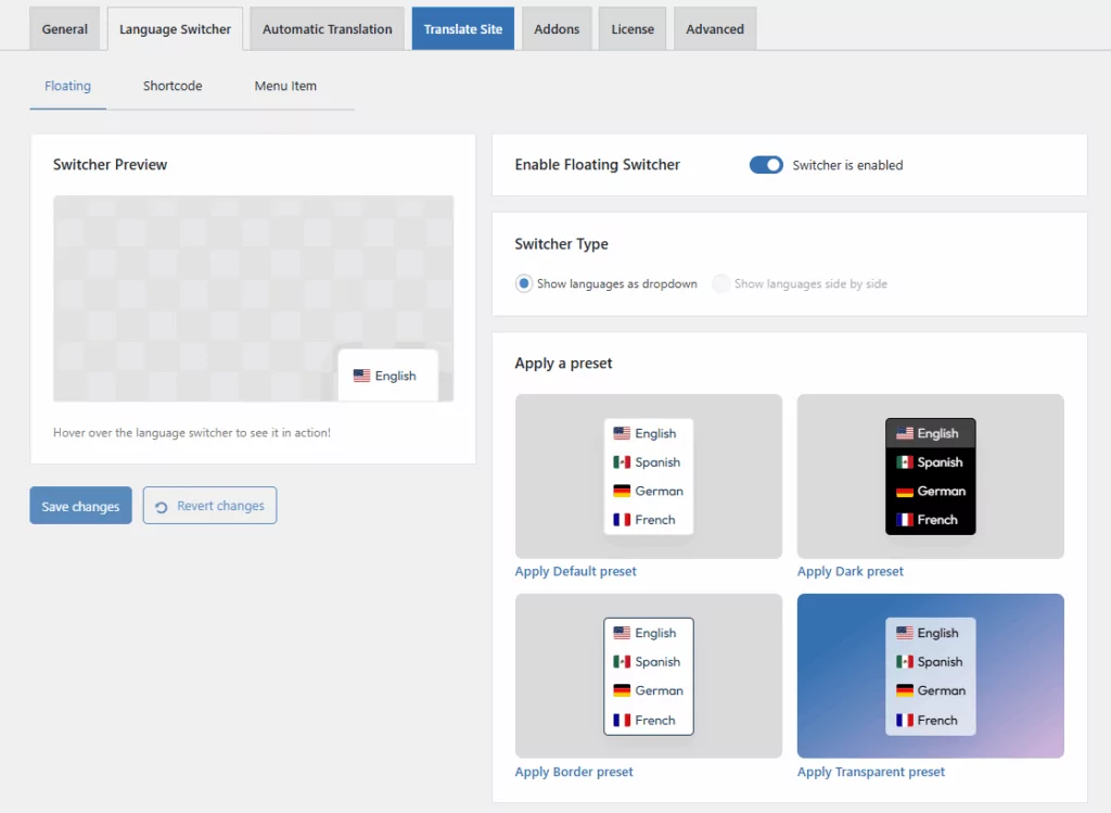 To help your visitors choose their preferred languages, TranslatePress automatically adds a floating language switcher to the bottom-right corner of your site. You can fully customize this switcher by going to Settings → TranslatePress → Language Switcher tab.